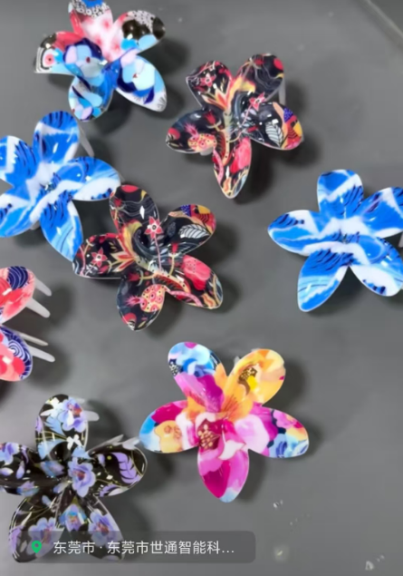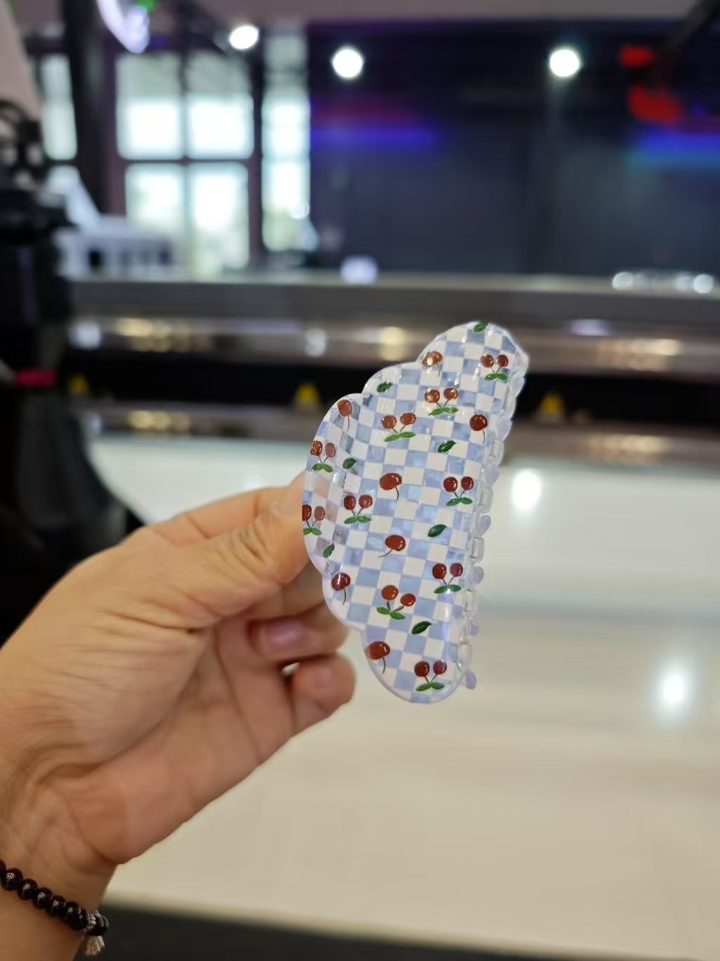材质突破:UV打印技术实现多种材质覆盖,发夹常用的亚克力、金属、塑料等材料都能完美适配。